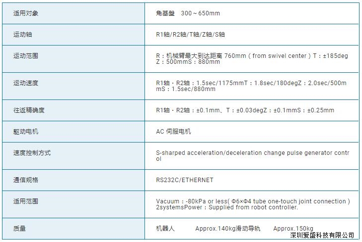 伺服电机一般环境用清洁机器人 产品特点 Supported up to max. 650mm square substrate. Supported to long stroke elevating. Specification 作者:admin